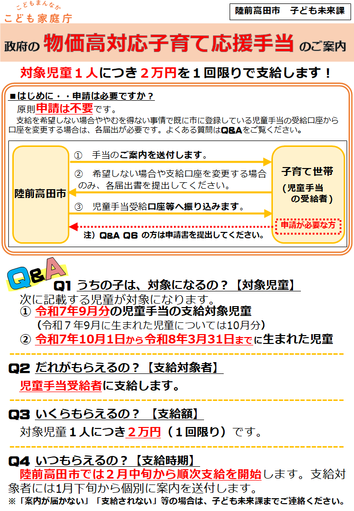 このたび、令和7年11月21日に閣議決定された「「強い経済」を実現する総合経済対策」において、0歳から高校3年生までのこどもたちに1人につき1回限り2万円の「物価高対応子育て応援手当」を支給することとされました。