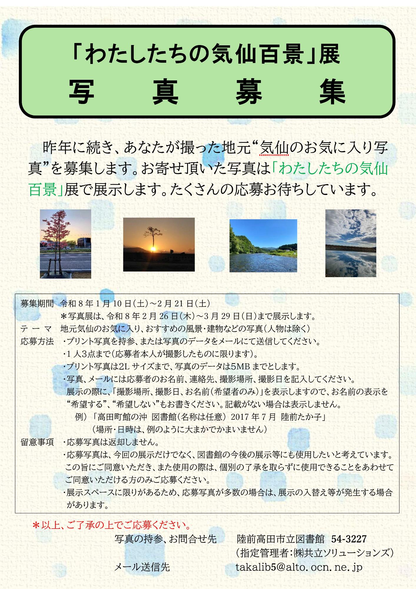 ・写真、メールには応募者のお名前、連絡先、撮影場所、撮影日を記入してください。