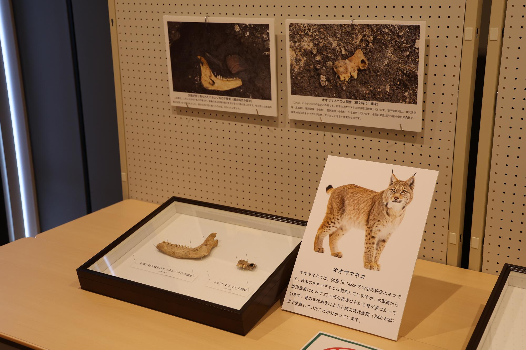 また、同会場では本年度の生涯学習の取り組みを振り返るパネル展示を実施。市主催の講座や各地区の公民館で開催された講座などの様子や受講者が作り上げた作品が展示されていました。その他にも、博物館のコーナーでは、縄文期に国内で生息していたオオヤマネコの一部を展示。オオヤマネコの出土は岩手県内では4例目となりますが、そのすべてが本市で出土されたものであり、来場者は興味深そうに見入っていました。
