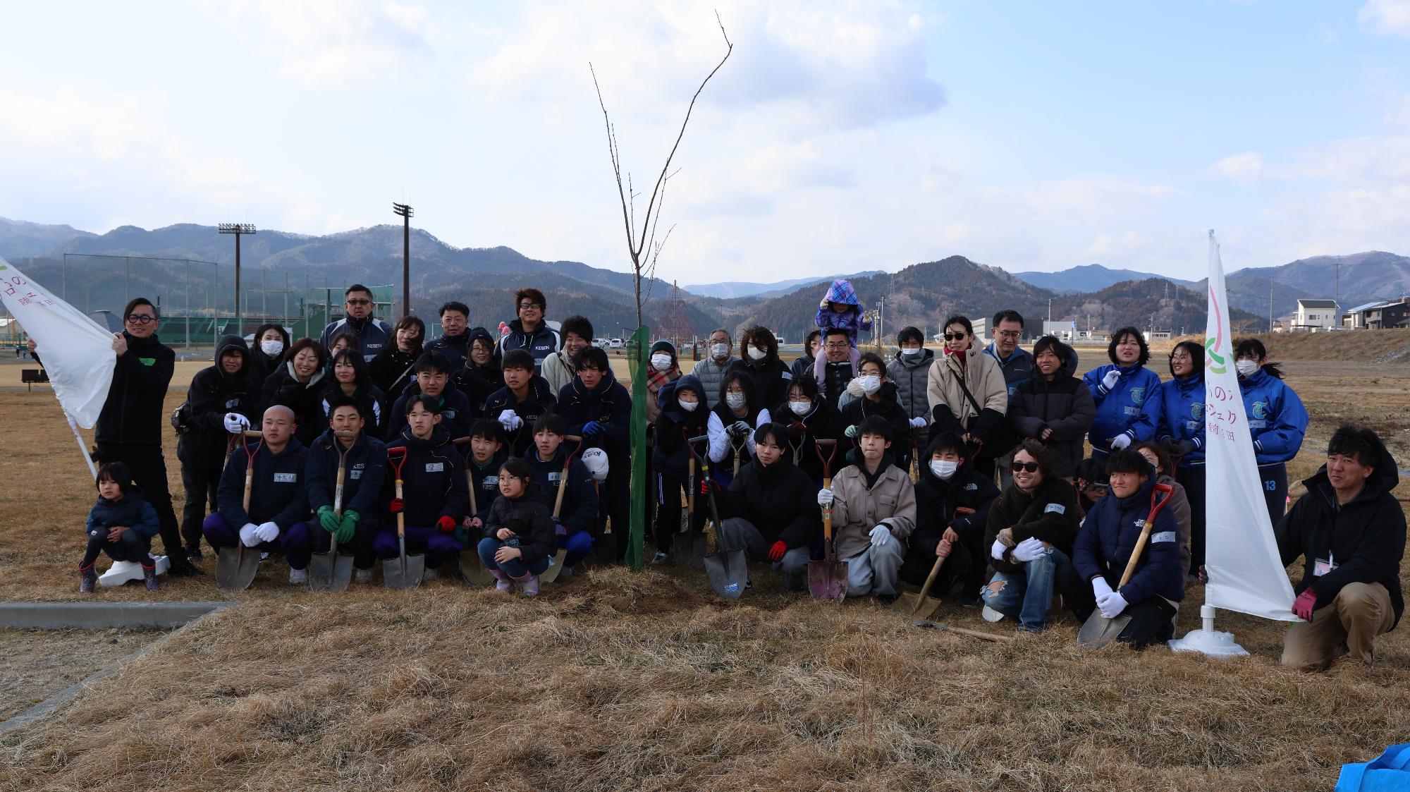 さくらの杜プロジェクト陸前高田協議会が主催する桜の植樹会が、気仙町と高田町の2会場で開催されました。本協議会は、津波被害によって未利用となった土地に3,000本以上の桜を植樹し、東北随一の名所『さくらの杜』を創り上げることで、交流人口の増加を目指し活動しています。