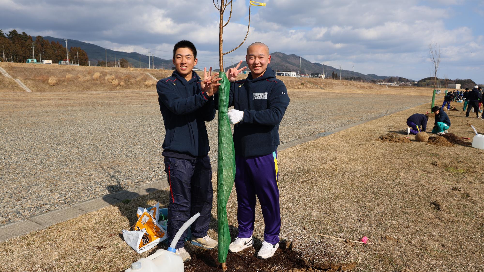 翌8日の高田松原運動公園の植樹会には、約60人が参加し40本の苗木を植えました。参加した湊俠太郎さん(大船渡町)は「穴を掘ったり植えたりするのは大変だったけれど、友達と楽しく取り組めました。今日植えた桜が成長した姿を、いつか見に来たいです」と笑顔で話していました。