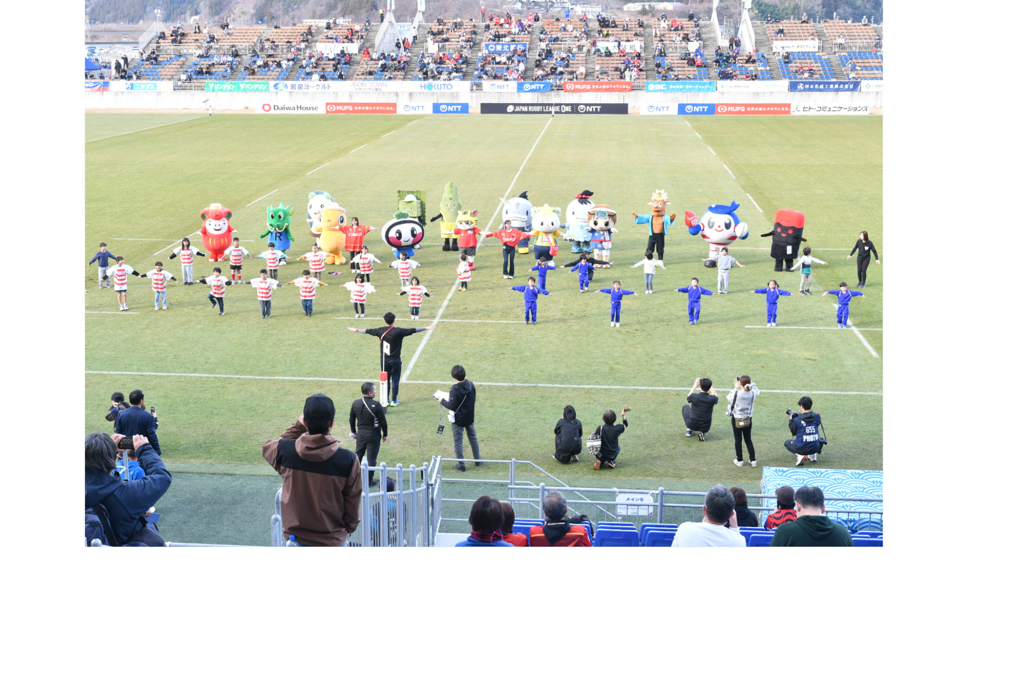 日本製鉄釜石シーウェイブス(以下、シーウェイブス)のホーム開幕戦が、21日(日曜日)に釜石鵜住居復興スタジアムで開催されました。 このホーム開幕戦に併せて、本市を含む岩手県沿岸13市町村で構成される「岩手三陸連携会議」から、14体のご当地キャラクターが集合。岩手県沿岸唯一のプロスポーツチームを応援し、会場を大きく盛り上げました。