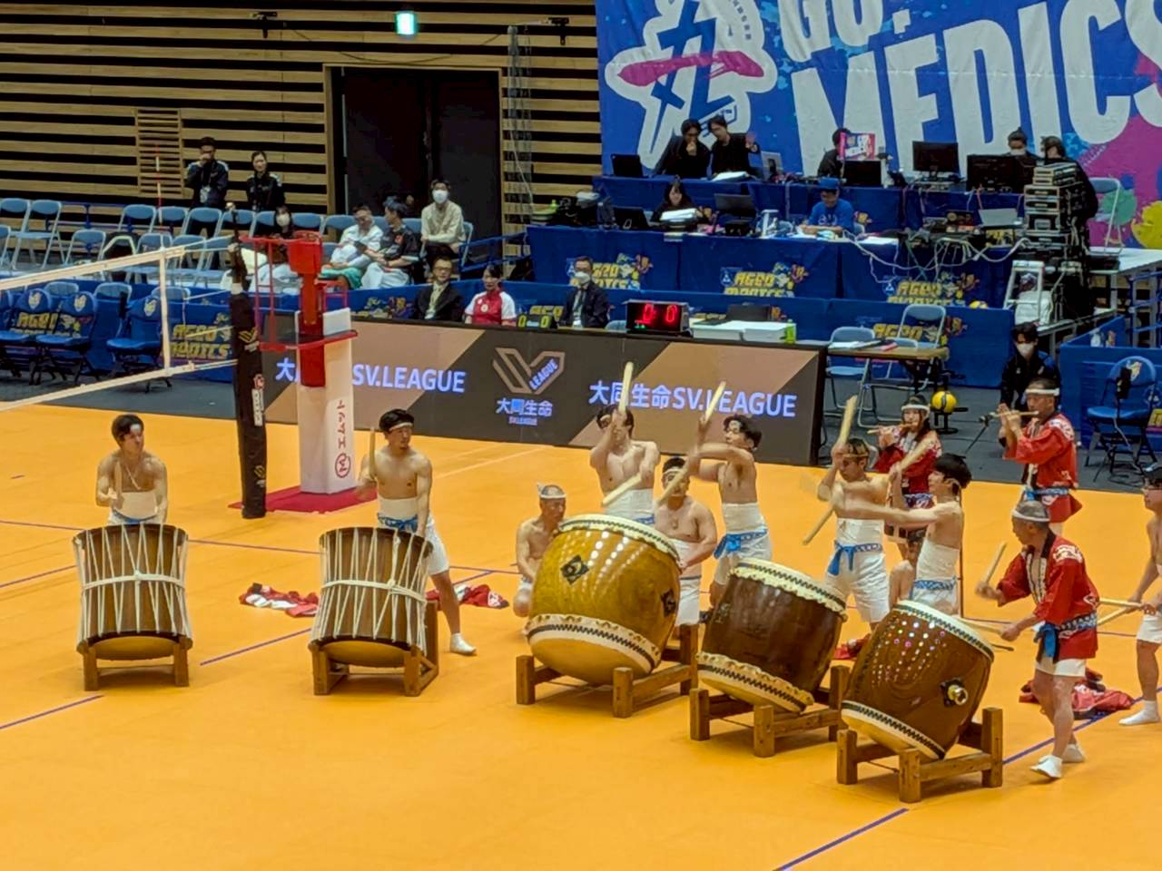 選手らはキッズエスコートとして沿岸地域の子どもたちと一緒に笑顔で会場入り。試合前には佐々木市長が力強いサーブによる始球式を行ったほか、セット間には気仙町けんか七夕保存会の皆さんが太鼓の演奏を披露し、エールを送りました。