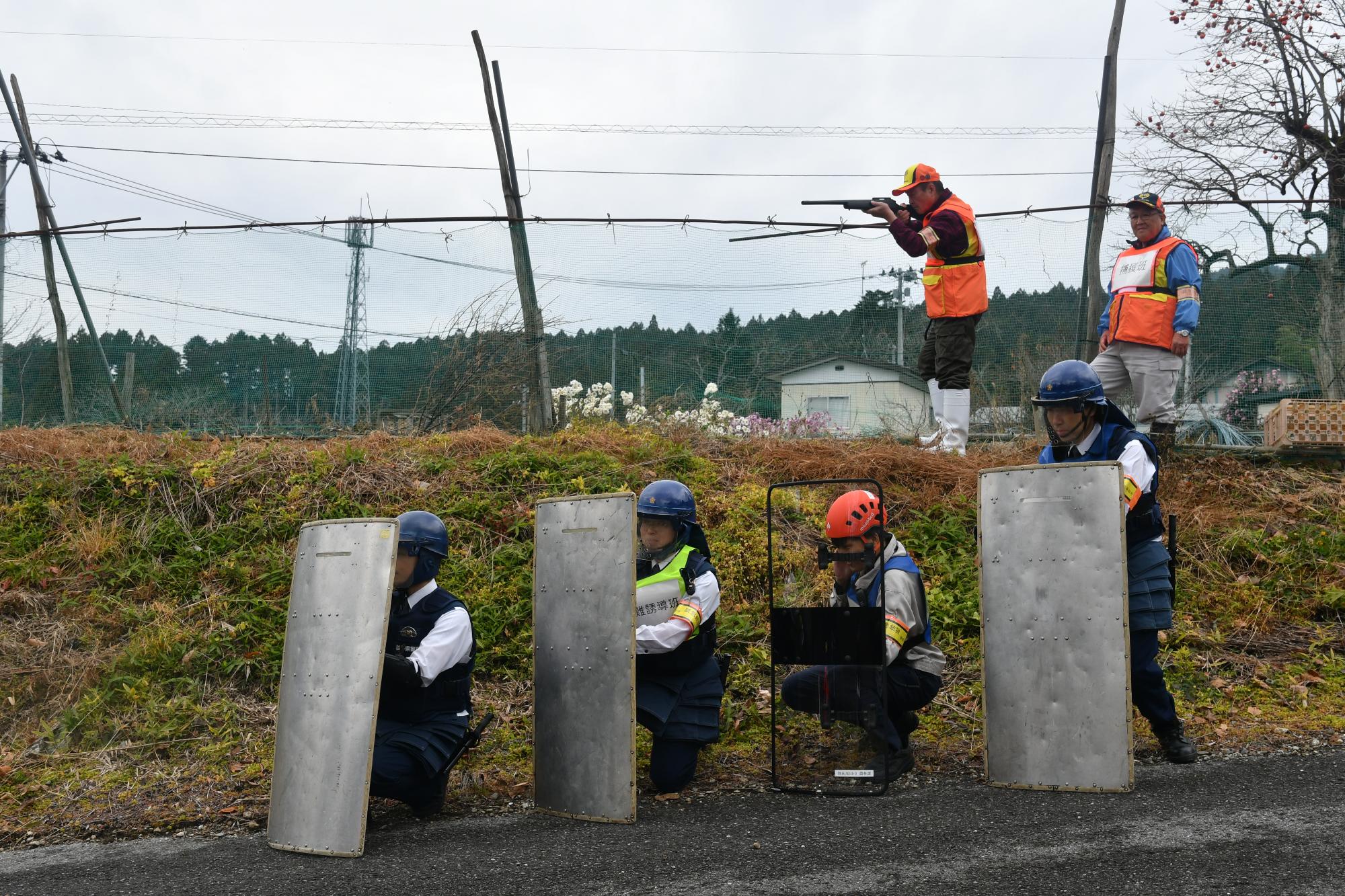 市街地などにクマが出没した際に、市町村長の判断でクマへの発砲が可能となる「緊急銃猟」の実地訓練を竹駒町滝の里町内会館付近で実施しました。