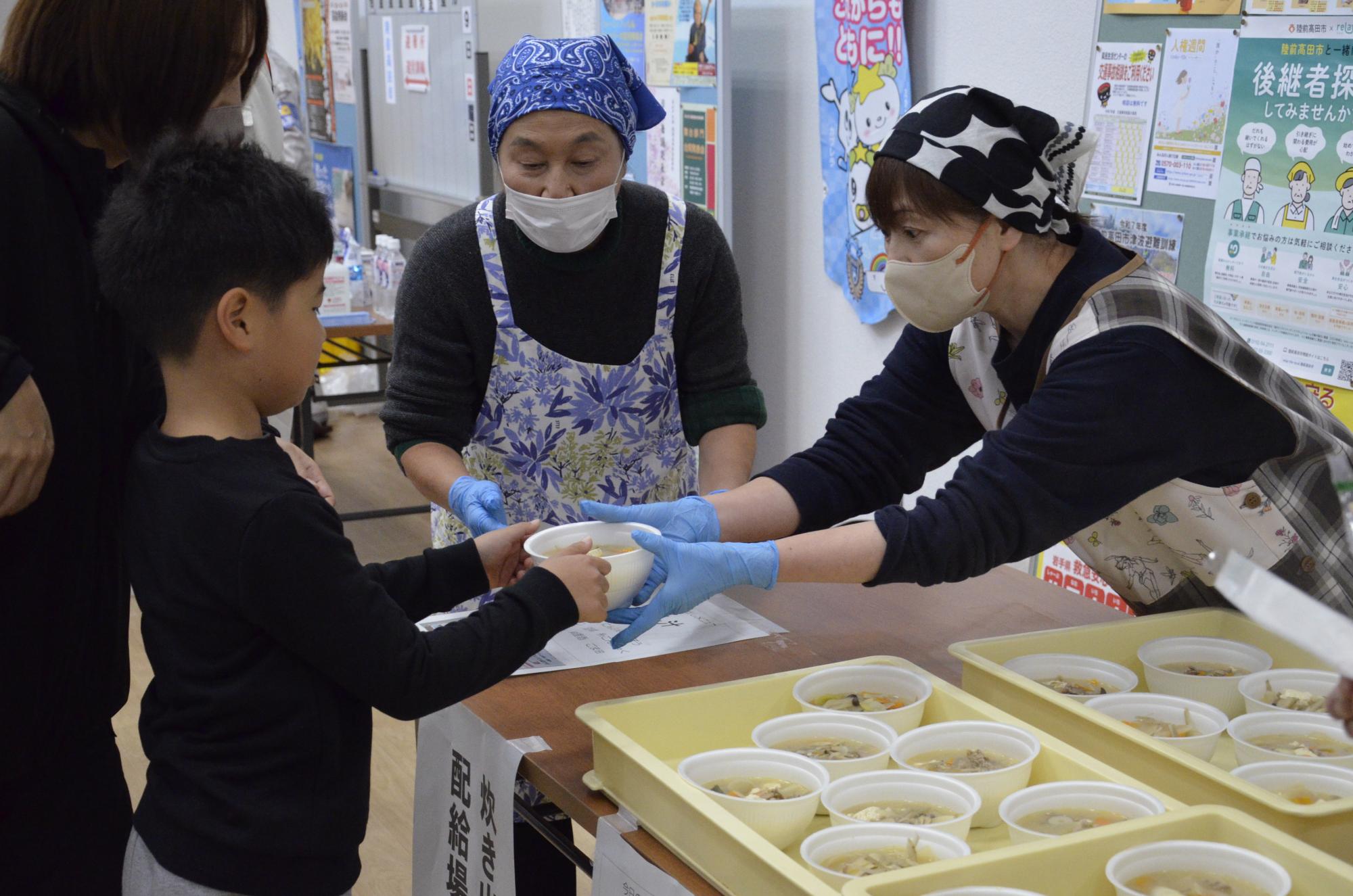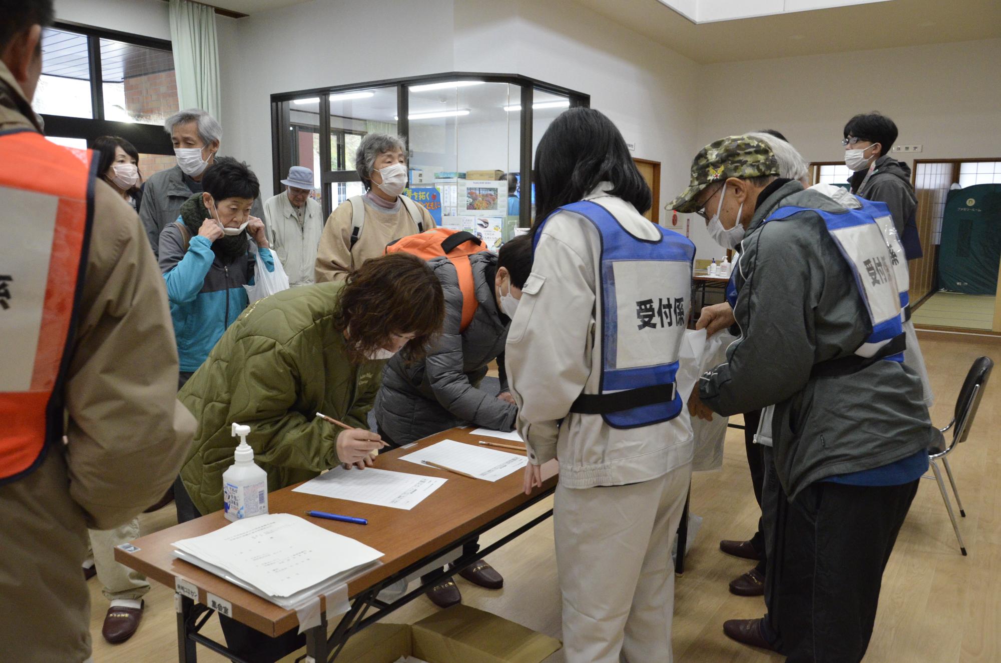 本訓練の後、米崎地区コミュニティセンターでは、避難所運営訓練が行われ、米崎町の町民約220人が参加。こちらの訓練では、避難者の受け入れ、段ボールベッドの組み立て、豚汁の炊き出しなどの有事の際に避難所運営で大切な手順を再確認し防災意識を高めました。