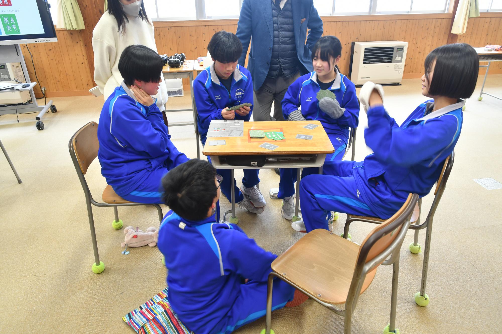 役割カードを加えてゲームを遊んだ後には、役割のある人もない人もみんなが楽しめるようにするための新しいルールを生徒たちに考えてもらいました。あるチームでは、床に座ってゲームに参加する車椅子役の人が机の上を見づらいことから、みんなが床の上で遊ぶルールを作り、他のチームではミトンをしていて手が不自由な役の人のために、カードを掴みやすいように工夫したりしながら、どうすればみんなが楽しめるようになるか意見を出し合っていました。