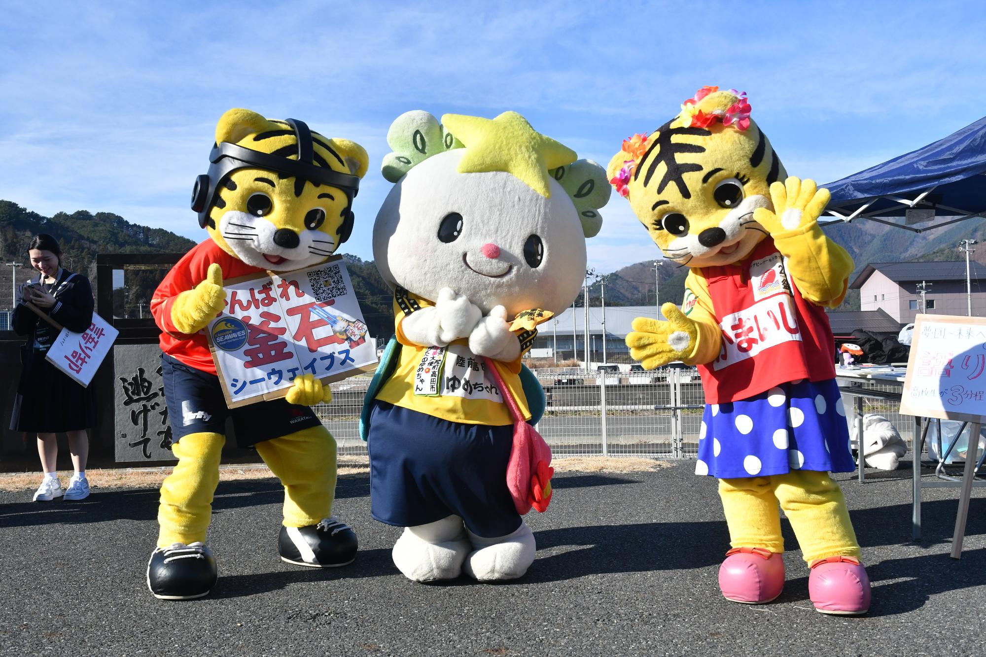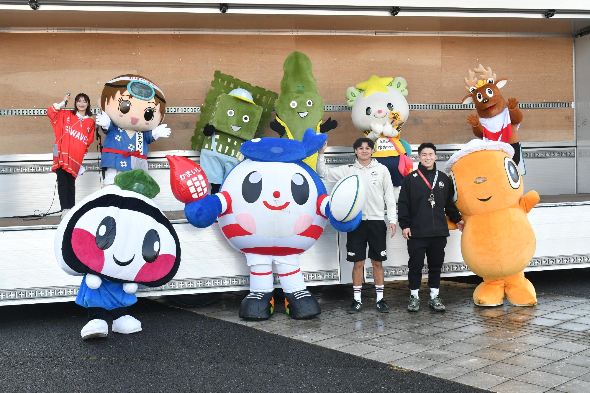 試合前のステージイベントでは、シーウェイブスの河野良太キャプテンが投げるラグビーボールのキャッチにキャラクター挑戦したり、クラブにまつわるクイズに答えるなどしたほか、来場者との撮影会も行われました。