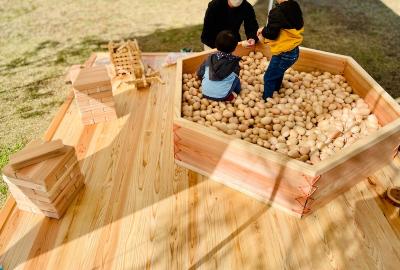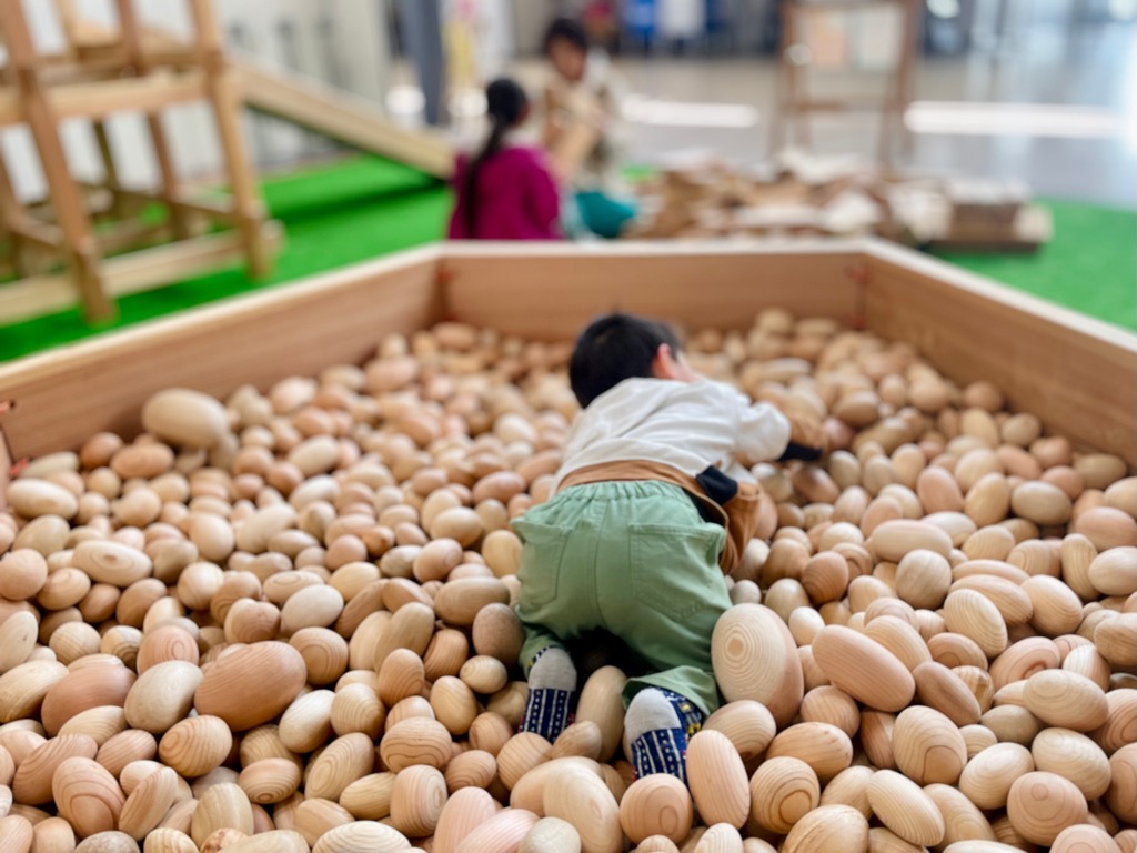 ・気仙スギ、ヒノキ、アカマツ、クリ、サクラ等多様な樹種による地元材を私用したボールプールです。大小様々な大きさと形をしており、色、手触り、香り等五感で楽しむことができます。