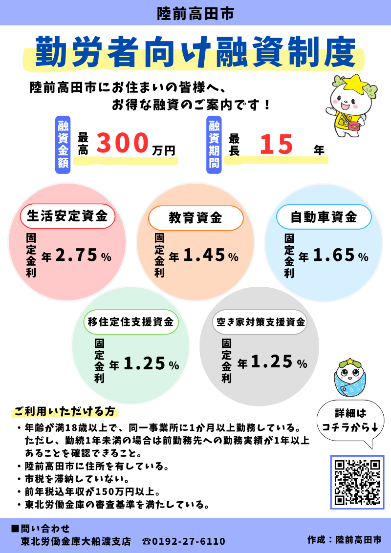 本市では東北労働金庫と提携して各種資金を低利で融資する制度を設けております。