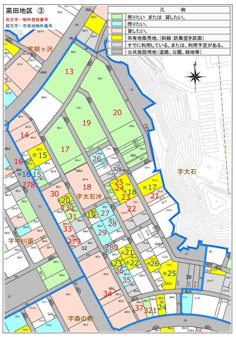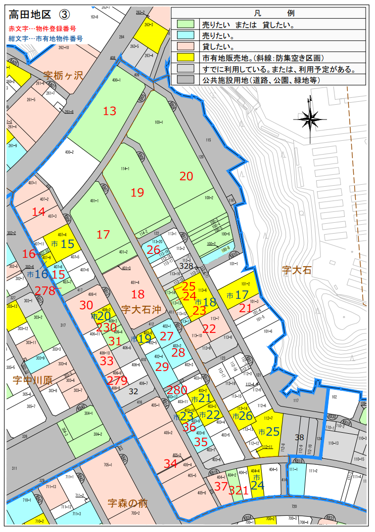 | 37 | 字大石沖 | 404-1 | 437.32 | 約132坪 | 賃貸 | - | 37台帳・宅地整備図(PDFファイル:723.5KB) |