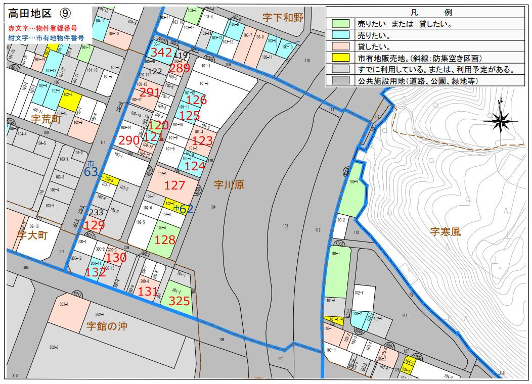 | 128 | 字川原 | 102-4 | 627.04 | 約190坪 | 売買又は賃貸 | - | 128台帳・宅地整備図(PDFファイル:498.7KB) | |