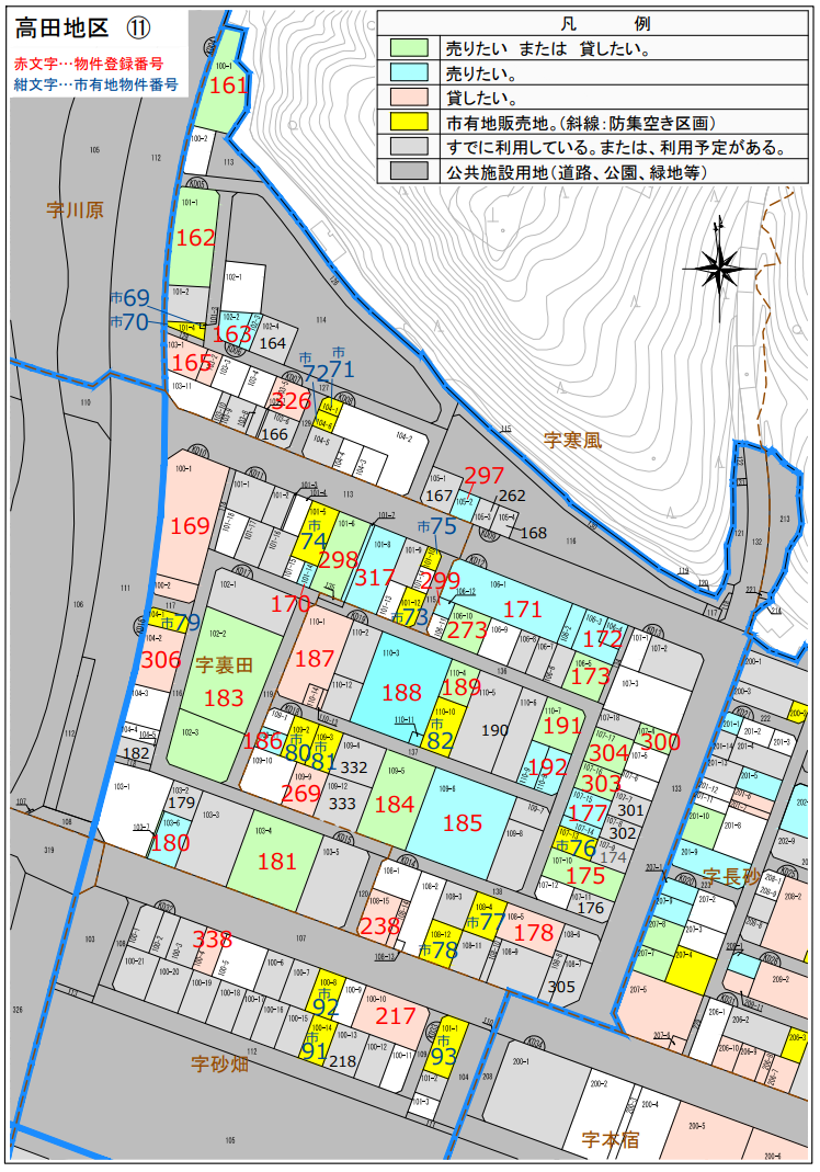 | 161 | 字寒風 | 100-1 | 838.31 | 約254坪 | 売買又は賃貸 | - | 161台帳・宅地整備図(PDFファイル:488.9KB) | |